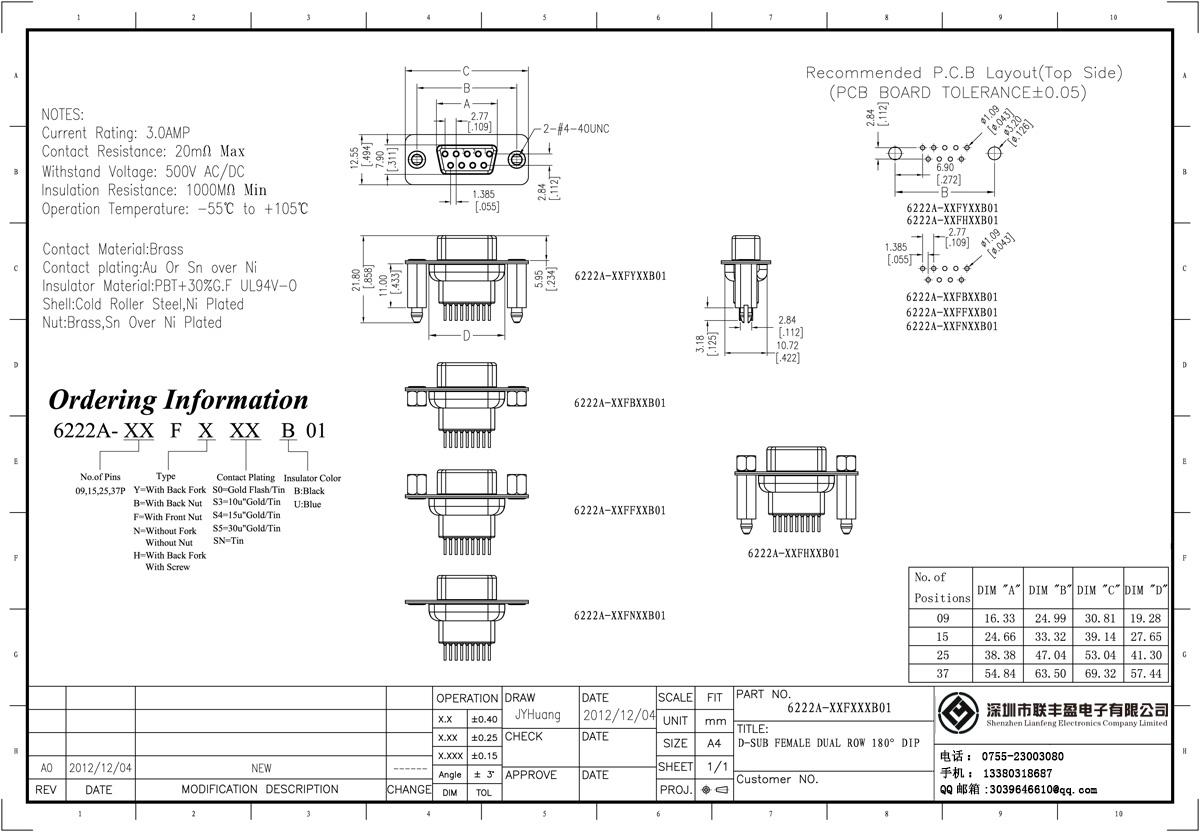 技術(shù)參數(shù):額定電流:3.0amp電流電阻:25mΩ最大絕緣電阻:1000mΩ min 承受電壓:AC 500V /分鐘工作溫度:55﹣℃+ 105℃接觸材料:黃銅觸點(diǎn)電鍍金或錫鎳絕緣體材質(zhì):聚酯(UL94V-0)標(biāo)準(zhǔn):PBT的+ 30%廣發(fā)殼:冷軋輥鋼、鍍鎳黃銅、錫在螺母:鍍鎳